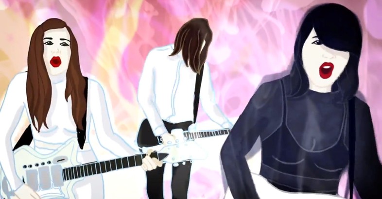 Wow, the new Dum Dum Girls video is incredible. For the sultry “Rimbaud Eyes”, the guitar four-piece appear as if in Jem and The Holograms, with frontwoman Dee Dee Penny a pastel faerie queen Pat Benetar who knows she has better hair than everyone else at the (peep) show. She struts down a sex shop hyperway, appears in Octopussy-ish 007 sillhouettes before – oh! – climaxing with her band in hyperspace on a heart-shaped platform. The clip was directed by musician and visual artist Tamaryn. [Source]